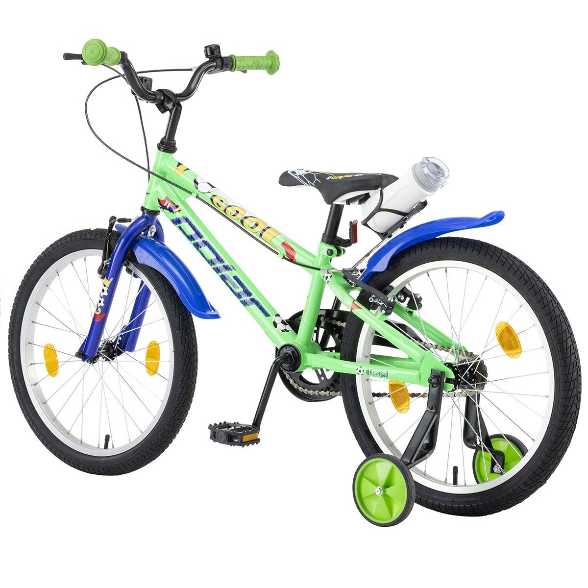 Περιλαμβάνονται βοηθητικές ρόδες, κουδουνάκι, φτερά, και παγούρι με βάση.